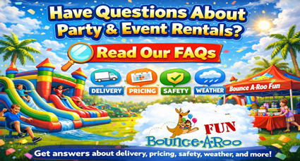 Get answers to all your questions about bounce house and event rentals with Bounce A Roo Fun. Our FAQ page covers everything from delivery, setup, pricing, deposits, and safety guidelines to weather policies and rental requirements. Learn about our licensed and insured services, flexible scheduling, and wide selection of inflatables, water slides, tents, and party equipment available in Jacksonville, FL and surrounding areas. Whether you're planning a birthday party, school event, or large festival, our FAQs provide the information you need for a smooth and stress-free experience.